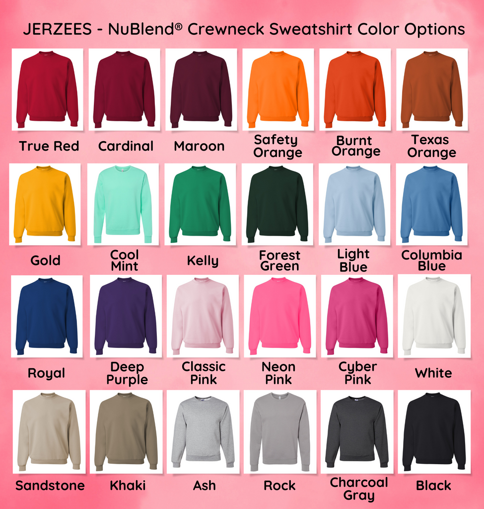 Sublimated design on white or sand Jerzee Sweatshirts.